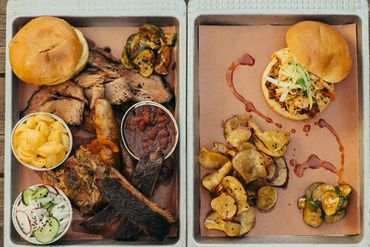 Brisket, Spicy Korean Pork and Turkey with Mac N Cheese, Kimchi Coleslaw, and Bbq Beans. Two buns and sauce (Table, Kitchen, Korean) Serves two people, no substitutions